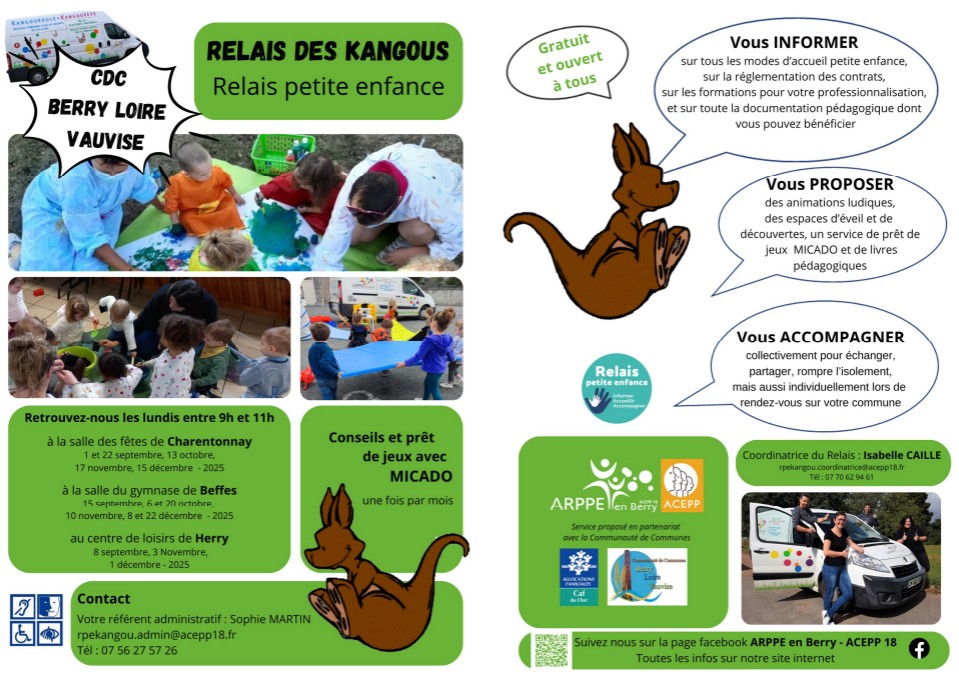 Le Relais Petite Enfance des Kangous c’est quoi ? Un service de l’Arppe en Berry se situant au Aix d’Angillon. Itinérant sur plusieurs Communautés de communes Un lieu au service des assistants maternels, gardes à domicile, parents et enfants (employeur ou pas) qui propose : Des animations Une fois par semaine le matin dans une commune avec un roulement selon le planning. Deux professionnelles installent un espace adapté et ludique dans une salle mise à disposition. Un lieu d’échange et de soutien où les petits et grands pourront partager et profiter de l’ animation Un accompagnement administratif et envoi de la liste des assistants maternels Un lieu d’information, d’orientation dont l’envoi de la liste des assistants maternels, d’accès aux droits et de soutien pour les parents dans leur rôle et fonction d’employeur Une aide administrative par Mails, téléphone, Visio mais aussi des rendez-vous individuel à la demande dans un bureau mis à disposition par la commune ou maison des services pour les parents et professionnels un lieu qui contribue à la professionnalisation des assistants maternels et gardes d’enfants à domicile.