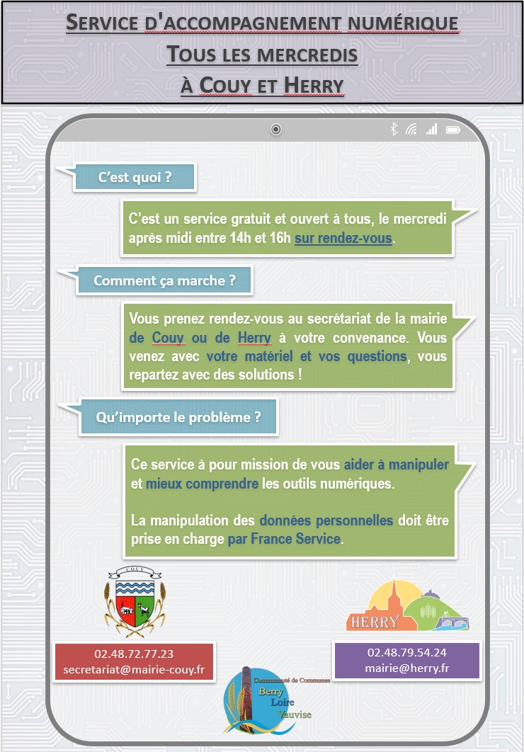 Au sein de la Communauté de communes " Berry Loire Vauvise" les ateliers numériques dispensés à Beffes, Couy et Herry sont ouverts sur les créneaux :