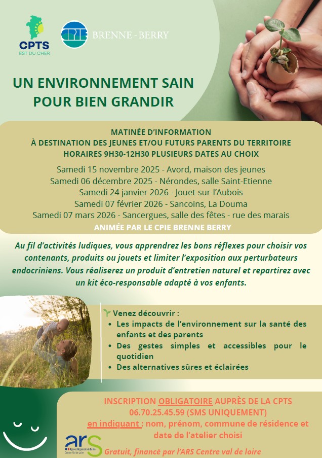 | La CPTS de l'Est du Cher, en partenariat avec le CPIE Brenne-Berry, propose plusieurs matinées d’information gratuites pour sensibiliser les familles aux impacts de l’environnement sur la santé : 👉 Samedi 15 novembre 2025 - Avord 👉 Samedi 06 décembre 2025 - Nérondes 👉 Samedi 24 janvier 2026 - Jouet-sur-l'Aubois 👉 Samedi 07 février 2026 - Sancoins 👉 Samedi 07 mars 2026 - Sancergues Au programme : - gestes simples pour limiter l’exposition aux perturbateurs endocriniens - création d’un produit d’entretien naturel - distribution d’un kit écoresponsable à chaque famille 🕓 9h30–12h30 | 📍 Plusieurs dates au choix >> INSCRIPTION PAR SMS UNIQUEMENT! 06.70.25.45.59 (1 matinée par famille) Une action gratuite et financée par l'Agence régionale de santé Centre-Val de Loire, pour un environnement plus sain et des familles en meilleure santé .
