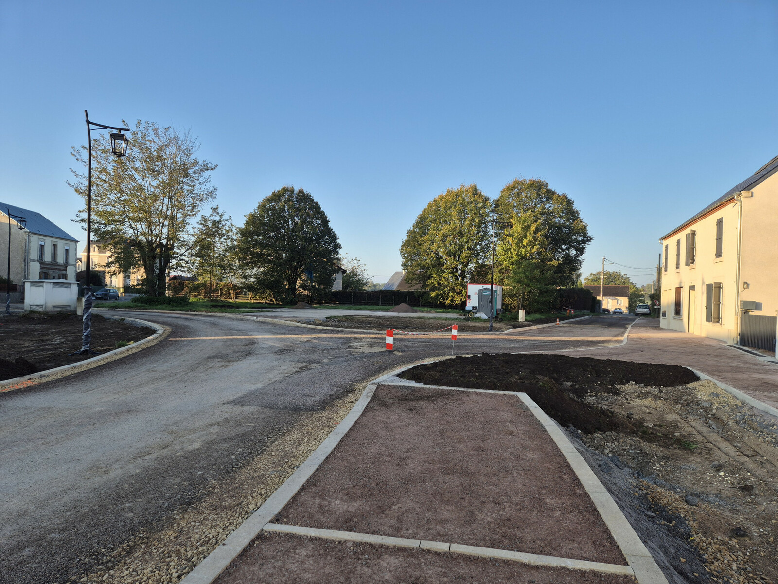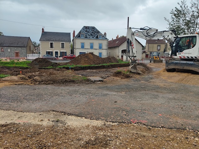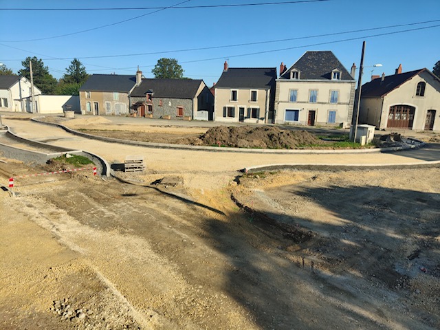 Après les reprises des réseaux d'eau, les travaux de réhabilitation de la Place du Plessis ont repris début septembre. L'entreprise Eiffage, retenue après la consultation dans le cadre des Marchés Publics, a entamé les travaux de voirie avec la réalisation de la nouvelle voie de circulation, des accotements et trottoirs et des noues paysagères.
