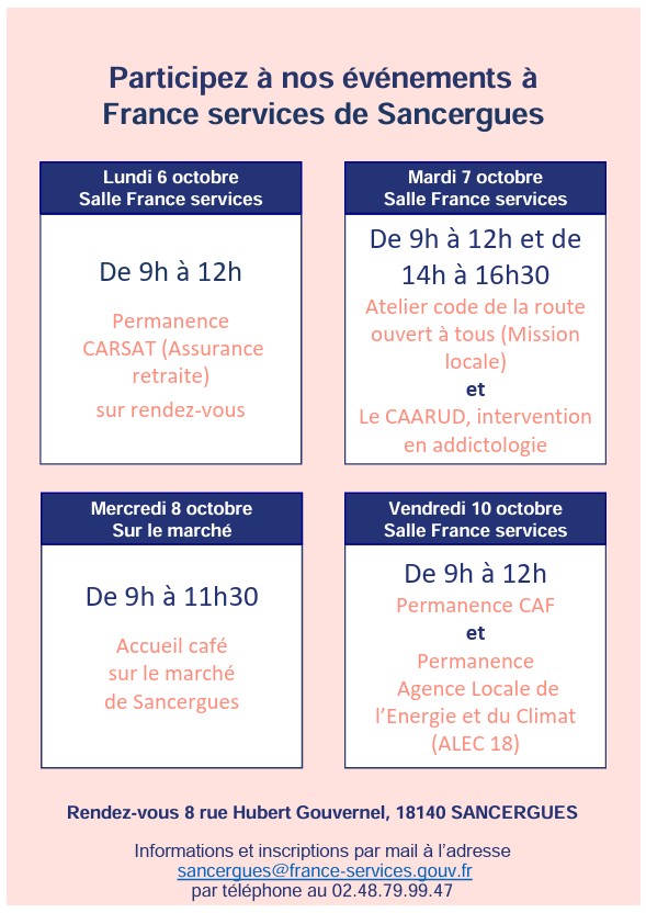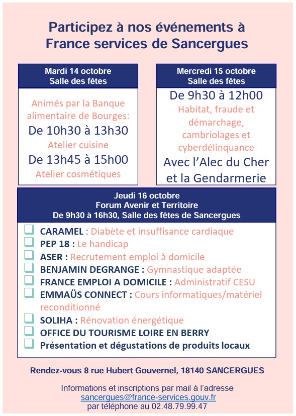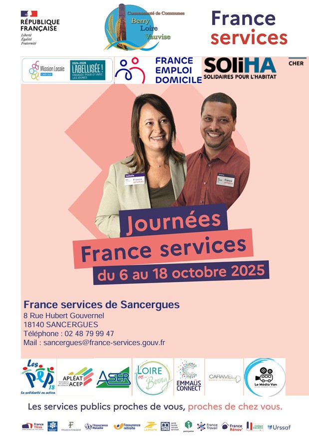 Mireille SOUM et Elise CLEMENT, conseillères, sont heureuses de vous présenter le programme de journées France services à Sancergues. " Vous aurez l'occasion de rencontrer les divers partenaires sur la Communauté de Communes Berry Loire Vauvise. Notre forum "Avenir et Territoire" sera le temps fort de ces journées jeudi 16 octobre. Celui-ci regroupera plusieurs interventions autour du handicap, de l'emploi à domicile, de la rénovation énergétique et bien plus encore. France services étant un service de proximité, il nous tenait à cœur d'inviter divers producteurs locaux et de leur donner la possibilité de mettre en avant leur travail. Aussi, plusieurs d'entre eux ont accepté de faire des dégustations à cette occasion (café, fromage, miel, confiseries...). Nous comptons sur votre soutien en partageant largement ces informations et serions ravies de vous retrouver du 6 au 16 octobre lors de ces manifestations. " Vous trouverez ci-joint le flyer que vous pouvez imprimer ou venir chercher à la mairie. Informations et inscription par mail : sancergues@france-services.gouv.fr ou téléphone au 02.48.79.99.47 |