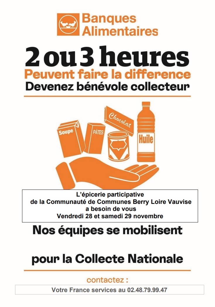 | Appel à bénévoles 📣Cette année, la Collecte nationale des Banques Alimentaires aura lieu le vendredi 28 et samedi 29 novembre. La collecte se fera sur les magasins Super U et Intermarché à la Charité sur Loire entre 8h30 et 18h, par équipe de deux personnes, sur un créneau de deux heures par équipe. Si vous souhaitez participer, contactez France Services au 02.48.79.99.47 (n'hésitez pas à laisser un message) En vous remerciant par avance de votre collaboration. |