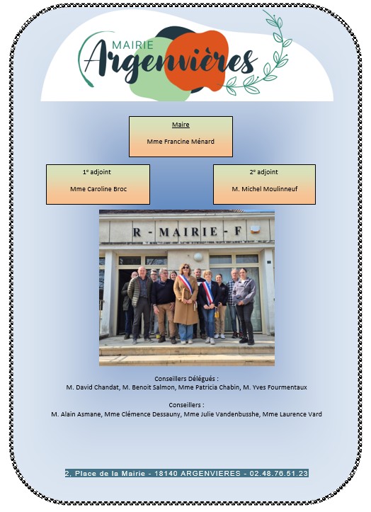 | Le dimanche 22 mars a eu lieu l'élection du Maire et des adjoints de la commune d'Argenvières. Ont été élus : Madame Francine Ménard, Maire, Madame Caroline Broc 1ère adjointe Monsieur Michel Moulinneuf 2ème adjoint. Conseillers Délégués : M. David Chandat, M. Benoit Salmon, Mme Patricia Chabin, M. Yves Fourmentaux Conseillers municipaux : M. Alain Asmane, Mme Clémence Dessauny, Mme Julie Vandenbusshe, Mme Laurence Vard |